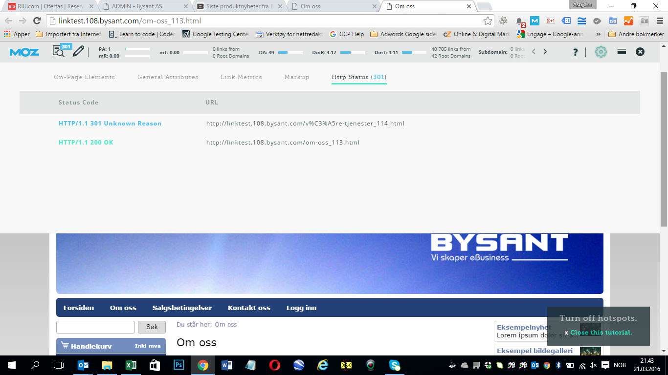 3. Etter denne endringen kan du klikke på: http://linktest.108.bysant.com/v%C3%A5re-tjenester_114.html på nytt og nå er det ikke lenger en «siden kan ikke vises» der, men en 301 til om oss siden i stedet.